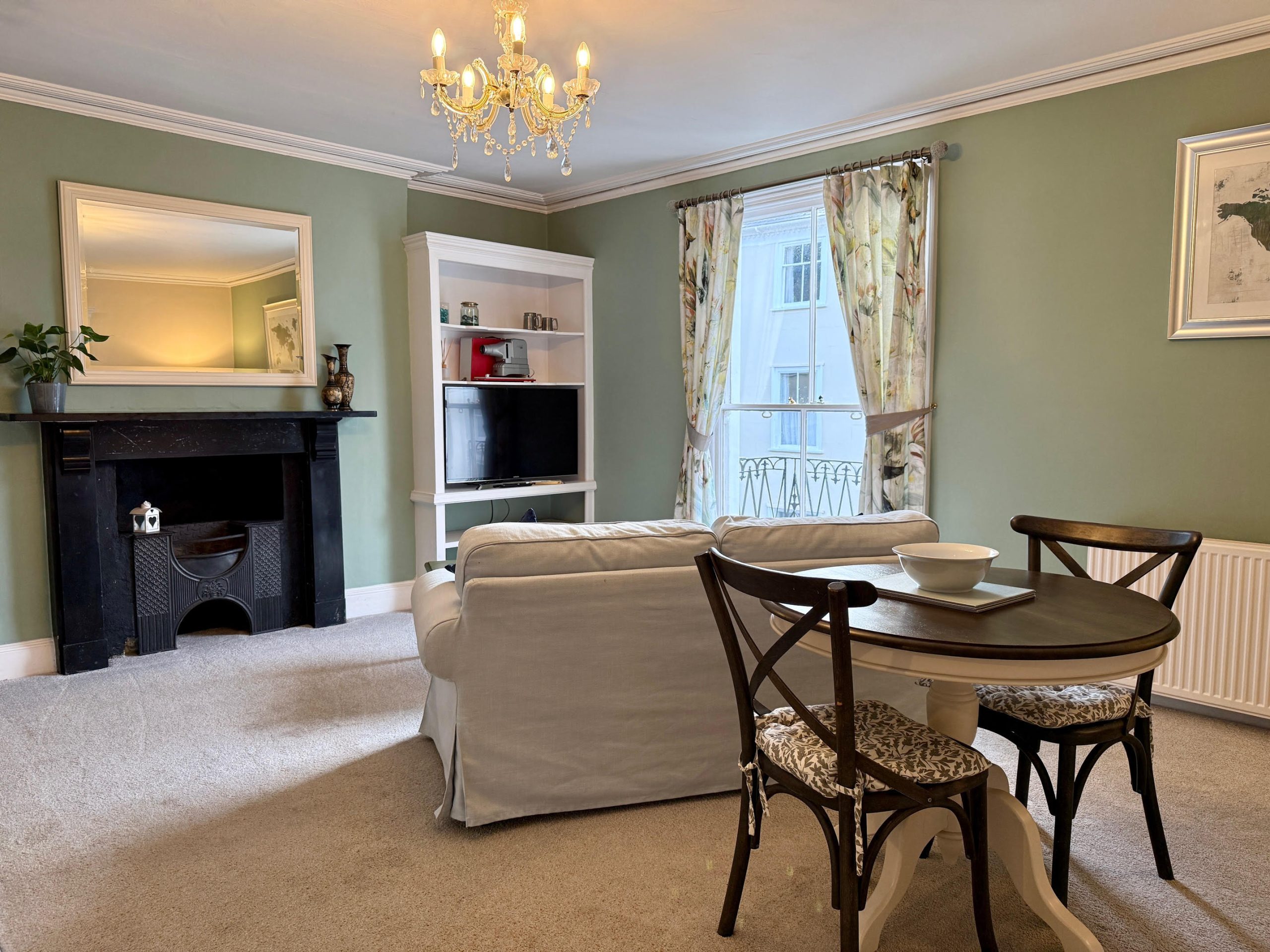 Located on the 1st floor this spacious self-catering apartment is comprised of a double bedroom looking out to the guest house garden and includes an armchair and fitted wardrobes. There is a roomy bathroom which has a shower over the full-size bath. The living / dining room has a comfy sofa, TV and dining table for two and is at the front of the building.